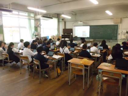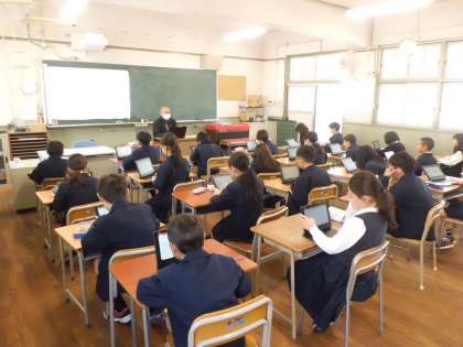 社会科では、インターネットで調べた都道府県の情報をもとに、プレゼンテーションソフトで3択のクイズを作って、お互いに出題しています。