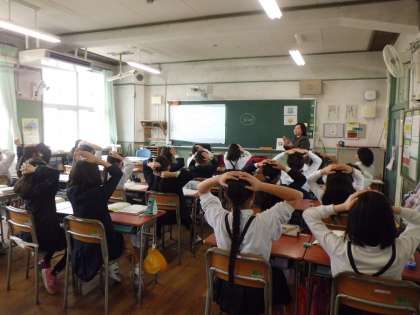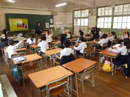 3年生から6年生では、外国語活動もスタートしています。今年度も昨年度に引き続き、桃谷中学校英語科の我妻先生とC-NETの先生が毎週金曜日に来てくださっています。C-NETの先生は、今年度からフィリピンご出身のベイヤー先生です。