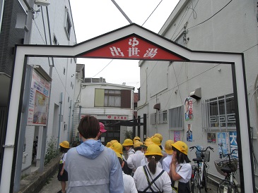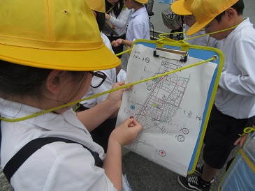 3年生は、社会科の学習として、地図を持って校区たんけんに行きました。お風呂屋さんや保育園などを見つけると地図に地図記号シールをはることができます。地図記号をゲットできた子どもたちはとても楽しそうでした。