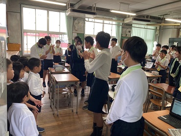 お礼の言葉が終わると、6年生が1年生のそばまで行ってハイタッチ!「また、遊ぼなー。」と、優しく声をかけていました。