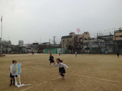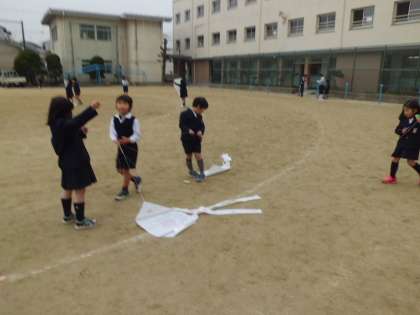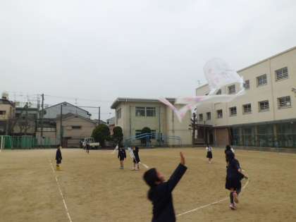 1年生が作ったたこを子どもどうしで協力してあげました。風がないため、走らないとあがりませんでしたが、楽しく活動することができました。
