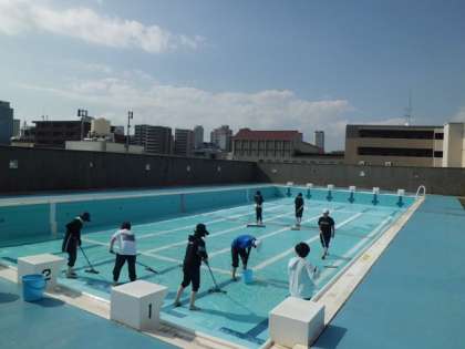 来週はいよいよプール開きです。そのプール開きへ向けて、放課後の時間を使って、もしもの時のための救急救命講習やプール掃除を教職員が力を合わせて進めています。
