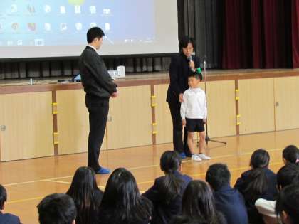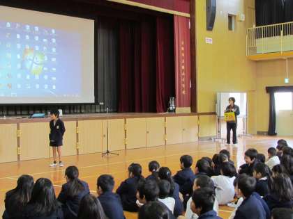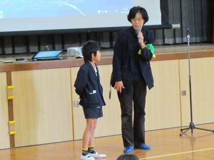 また、代表の子どもたちが教えていただいたことを実演し、それにあわせ、声を出すことや不審者と思われる人ととる距離など詳しく解説していただきました。自分を守るための大切な学習をすることができました。