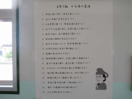 1学期の学習もいよいよまとめの時期になってきました。6年生の教室前に国語と社会の掲示物を展示しています。国語は「インターネットの投稿を読み比べよう」の単元で、スポーツに対する取り組み方について、自分の立場を明確にして意見を疑似投稿しました。自分の体験をもとにしたものや偉人・有名人の言葉からの考え、四字熟語やことわざを使ったものや問いかけ形式のものなど様々な工夫を使って意見を考えています。社会科では「6年1組 十七条の憲法」をクラスの全員で考え、良いクラスになるようにいつも心に刻んでおこうと学習しました。学校にお立ち寄りの際には、ぜひご覧ください!