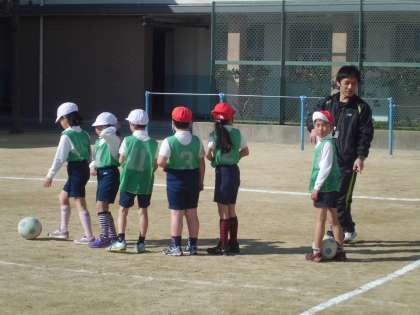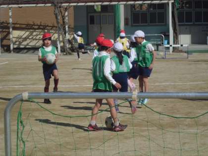 2時限目、2年生が体育科で「ボールけりゲーム」の学習をしました。4つのグループに分かれ、互いにパスをしたり、ゴールをめがけてボールを力強く蹴ったりしました。慣れてくると、パスでもらったボールを直接、蹴る練習にも取り組みました。