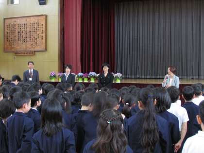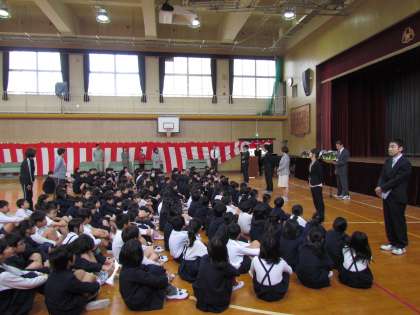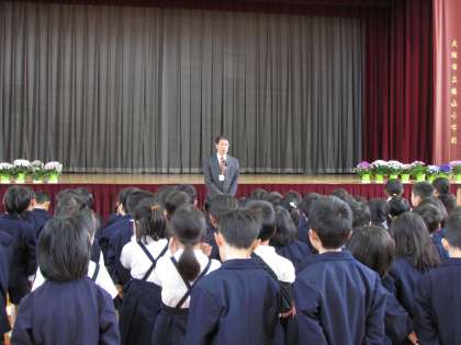 4月8日(金)転任してきた教職員の紹介(着任式)の後、担任発表を行いました。子どもたちは自分の担任の先生は誰かと興味津々でした。始業式では校長(私)の話で「新しい年度になり、新たな目標をもって今年1年頑張りましょう」という話をしました。最後に昨日入学してきた1年生と2〜6年生との対面式を行いました。今日から全員がそろっての平成28年度の船出です。