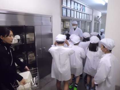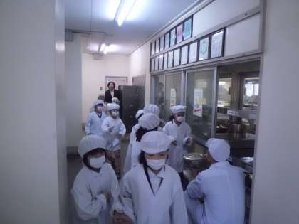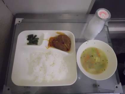 4月18日(月)給食室の様子です。今日の給食は「煮込みハンバーグ、コーンスープ、三度豆のサラダ、ご飯、牛乳」です。学級担任引率のもと、食器やおかず、牛乳など分担して運びます。運んだあとは、子どもたちが配膳をしていきます。