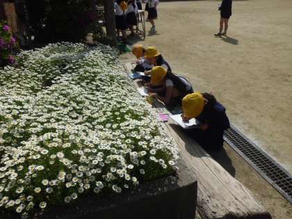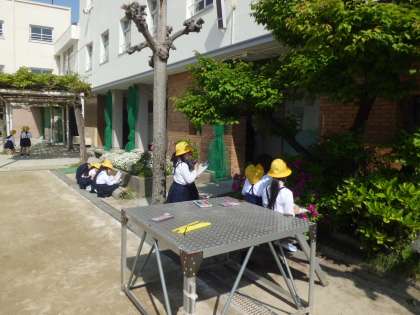 4月19日(火)つつじが赤い花をつけています。いい天気になりました。4年生が理科の学習で学習園や運動場のまわりに生えている植物の観察を行いました。改めてじっくり見ると、いろいろな植物が生えていることがよくわかると思います。