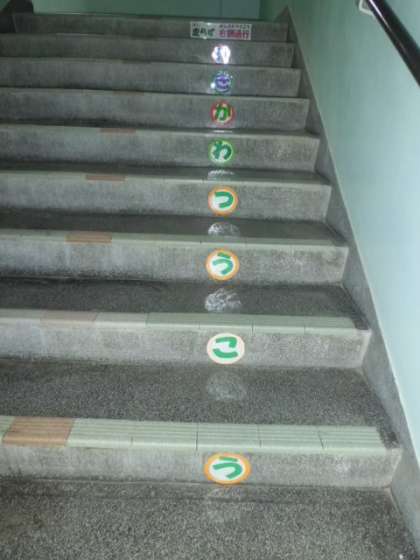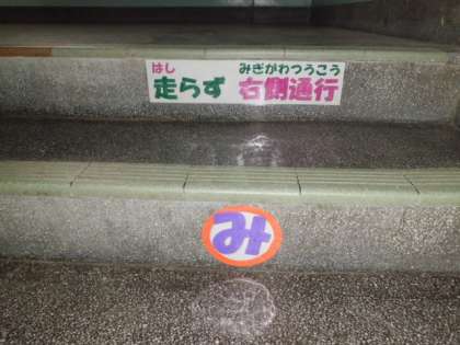 子どもたちが階段を意識して右側を通るように、「みぎがわつうこう」の表示が階段部分につけられました。