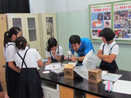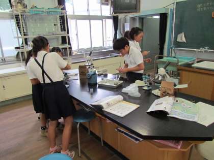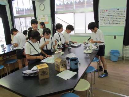 6月15日(水)3時限目、5年の理科でメダカについての学習です。メダカの餌を調べるために、学校の池に住む小さな生き物(動物性プランクトン・植物性プランクトン)を顕微鏡を使って調べました。ゾウリムシ、ツリガネムシ、アオミドロ、イカダモ等たくさん見つけることができました。