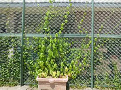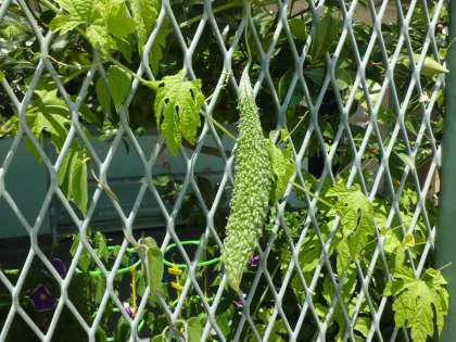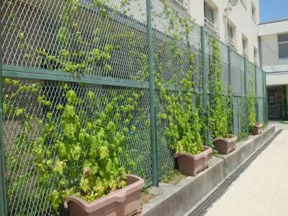 7月6日(水)西校舎のフェンスのところに今年も緑のカーテンとしてにがうり(ゴーヤー)を植えています。1年のアサガオや学習園のひまわりなどこの暑さで元気がありません。