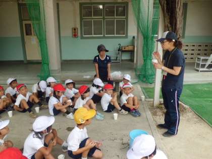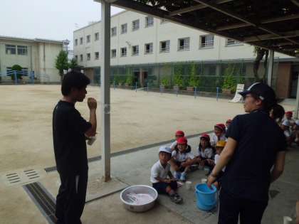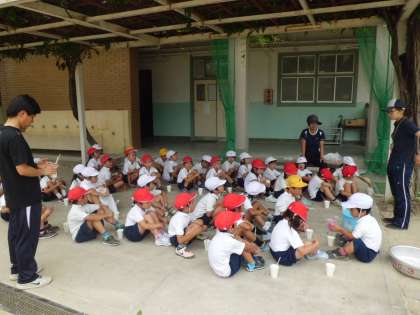 7月8日(金)1年生が生活科の学習でシャボン玉遊びを行いました。藤棚の下で全員に説明があり、その後、各自でシャボン玉をふくらませました。シャボン玉が空中に舞いあがると子どもたちは大喜びでした。