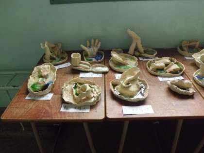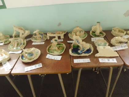 今、教室の前で6年生の図画工作科の作品を展示しています。粘土で造形した作品を焼く時に、砕いたガラスを敷き詰め一緒に焼き上げることによって、味わい深い作品ができあがりました。
