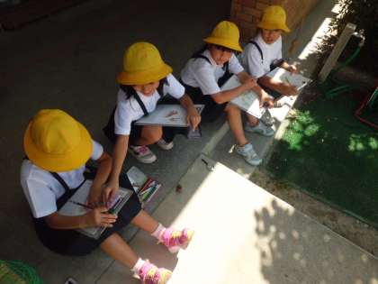 昨日、九州から東海にかけて梅雨があけました。大阪では例年より3日ほど早いといいます。本格的な夏の到来です。2時限目に4年生が運動場や学習園のところで観察学習をしていました。その様子です。学習園のひまわりが大人の背丈よりも高くなっていました。