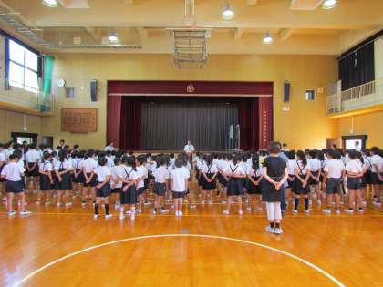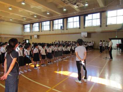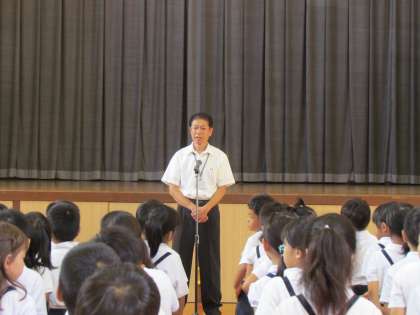 梅雨も明け、日陰に入るとさわやかな感じの朝になりました。7月20日(水)1学期の終業式を講堂で行いました。まず、私(校長)の話、その後に生活指導、プール開放についての話と続きました。最後に大きな声で校歌を3番まで歌いました。