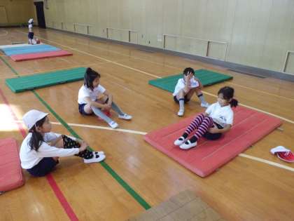 2年1組の体育学習の様子です。マット遊びを行っています。