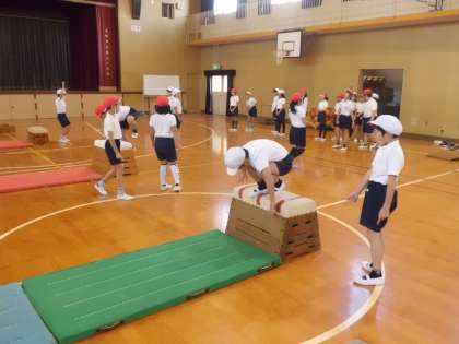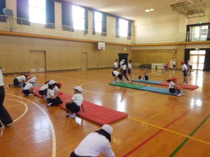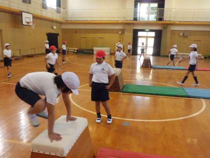 3年体育学習の様子です。器械運動の跳び箱運動をしています。(一部マット運動)