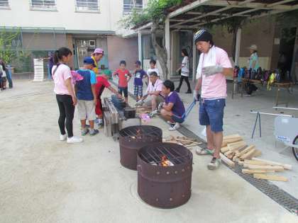 飯盒炊飯の様子。青少年指導員の皆さんに手伝っていただきカレー作りをしました。協力し合ってカレーを煮込みました。