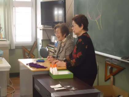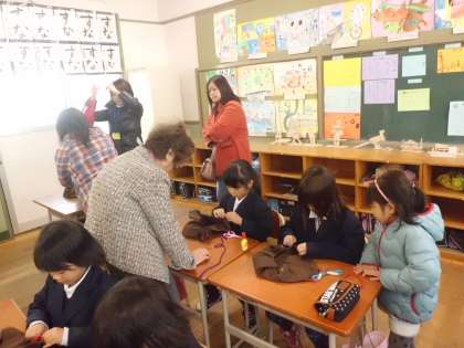 布にひもを通しアップリケを付け、かわいい巾着ぶくろをつくりました。