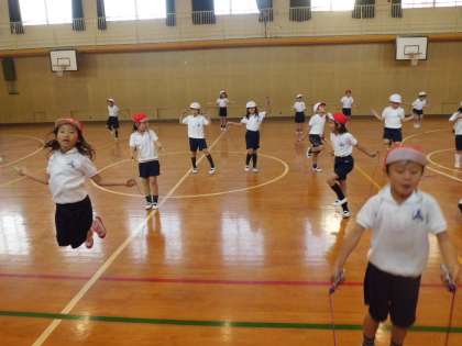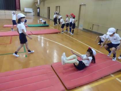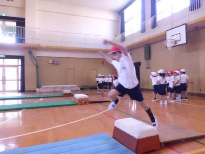1年生の体育学習の様子です。なわ跳び運動の後、器械・器具を使った運動遊びを行いました。