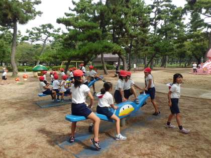 本日3・4年生は浜寺公園に遠足に行きました。園内のバラの花や木々を観察し、昔浜辺であった面影の残る松林を散策しました。その後いろいろな遊具で思いっきり遊びました。中でも人気のあったのはシーソーで、いつもたくさんの子ども達でにぎわっていました。