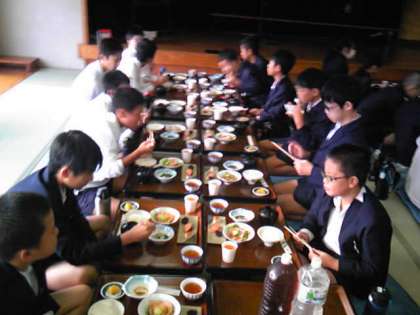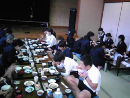 修学旅行2日目です。並べられたお膳で朝食を食べています。参加者は全員元気で、今日の活動開始です。