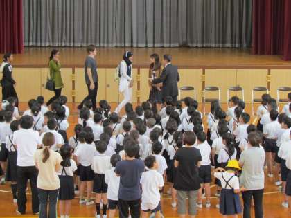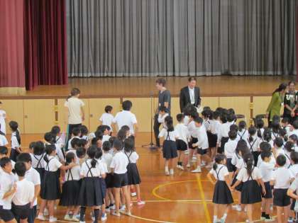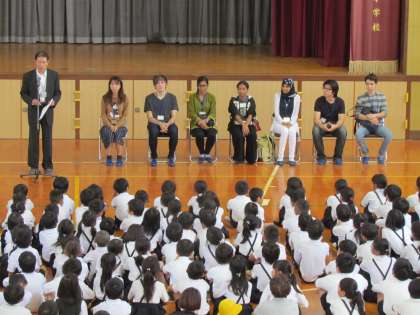 10月20日(木)今年で5年目になりますが、外国人留学生の方にきてもらい、ふれあい国際交流活動を行いました。4時限目は児童全員との対面式です。今年は中国、アルゼンチン、マダガスカル、アメリカ、サウジアラビア、グアテマラ、タジキスタンの国々の留学生です。その後、各教室で交流を行い、一緒に給食を食べました。初対面ですが、子どもたちは人懐っこく留学生に話しかけていました。