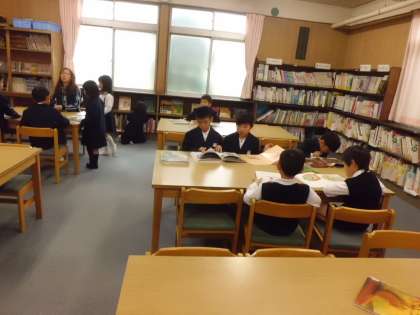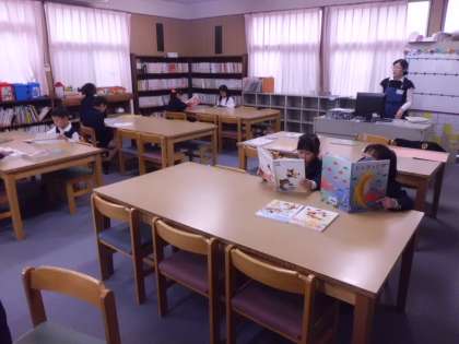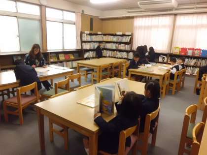 11月8日(火)1年2組の図書の時間です。図書館補助員の方もおられ、本の貸し出しなど、パソコンを使って行っています。静かに本を読んでいました。