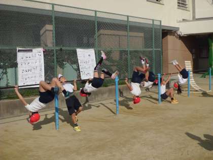 11月18日(金)、1時限目3年体育科学習の様子です。今日の学習は、鉄棒運動でした。膝掛け振り上がり・逆上がりなど、自分がめあてとする運動に取り組みました。何度も真剣に、繰り返し練習していました。