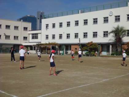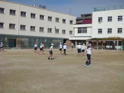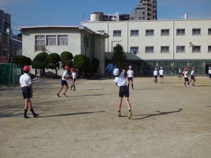 11月25日2時限目、6年が体育科で「フラッグフットボール」の学習をしました。ラグビーボールのような楕円形のボールを使い、パスやランを組み合わせて競技します。写真は、友だちとパスの練習をしている場面です。楕円球なので投げるのが難しいのですが、熱心に練習していました。