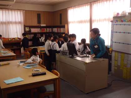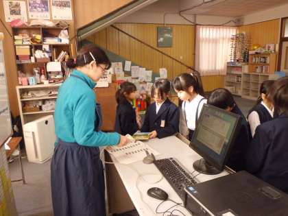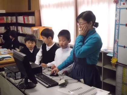 11月29日(火)4時限目、2年図書の時間の様子です。図書補助員の先生に本の返却・貸し出し、さらにパソコンで本の題名から、本のあるところを見つけてもらいました。子どもたちはたんだんと図書館利用の仕方が身について、読書態度もとてもよかったです。