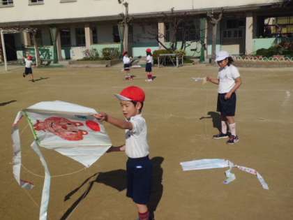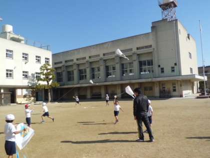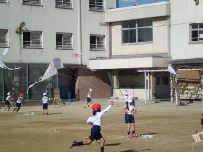 1年生が運動場で手作りのたこあげをしました。紙製のものではなく、ビニル製のたこです。子どもたちが糸を持って運動場を駆けると、たこは空中にどんどんあがり、歓声が聞こえました。