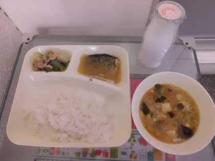 12月9日(金)の給食はさばのみぞれかけ、みそ汁、おおさかしろなの煮びたし、ごはん、牛乳です。さばのみぞれかけは大根おろしがかかり、あっさりと食べることができました。みそ汁は具だくさんです。大阪の伝統野菜を使ったおおさかしろなの煮びたしもごはんのおかずによかったです。