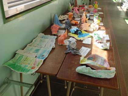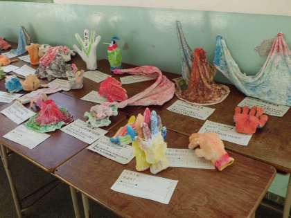 6年教室前で、今、図画工作科の作品が展示されています。タオルや軍手を液体粘土で固めて作った作品で、子ども達の豊かなイマジネーションが生かされています。
