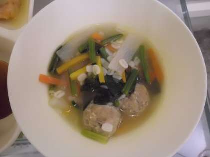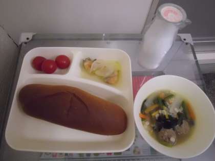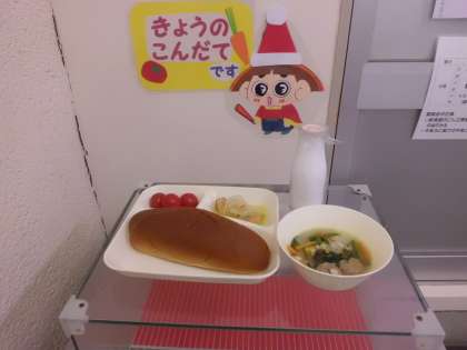 12月21日(水)2学期最後の給食です。今日はさけのマリネ、肉だんごと麦のスープ、プチトマト、パン、牛乳です。さけのマリネは甘酸っぱくて食欲の増すおかずでした。麦のスープは麦の食感がよかったです。1年生の給食準備の様子です。
