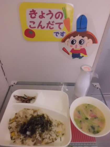 1月11日(水)平成29年になって初めての給食です。給食室内も新年の飾りつけをしてもらっています。今日の献立は、きんぴらちらし、ぞう煮、ごまめ、きざみのり、牛乳です。正月にちなんだ献立です。おいしくいただきました。