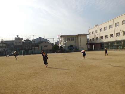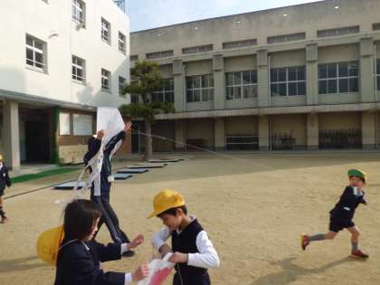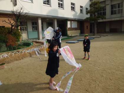 1月19日(木)1年2組が運動場で手作りのたこあげをしていました。風がそれほど吹いてないので、走らないとあがりません。夢中で走っていると、ほかの人の糸が絡んでもとにもどすのがたいへんでした。