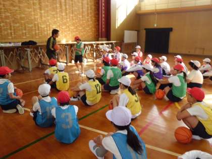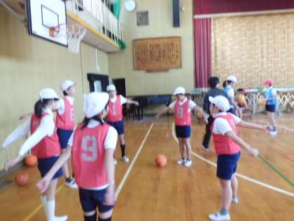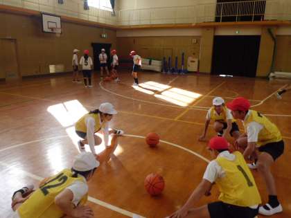 2月10日(金)6年生の体育学習でバスケットボールをしています。6つのグループに分かれて、準備運動、主運動と行っていきます。