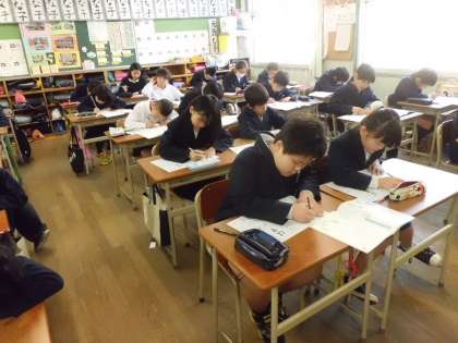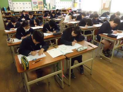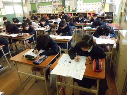 2月13日(月)4年書写学習の様子です。手本を見ながら、書写ノートに書き写していました。姿勢のよい児童が多く、熱心に取り組んでいました。