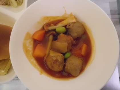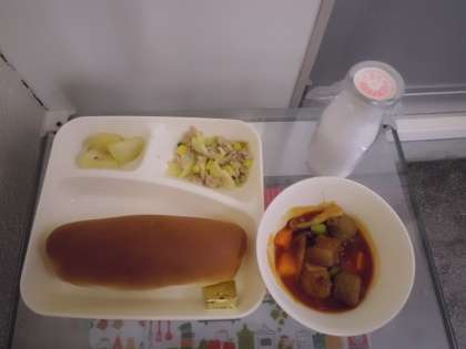 2月13日(月)今日の給食です。ミートボールのケチャップ煮、ツナと野菜のソテー、焼きじゃが、コッペパン。バター、牛乳です。ミートボールは子どもの好きなおかずです。ケチャップ味でおいしくいただきました。