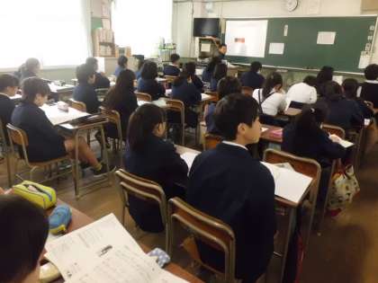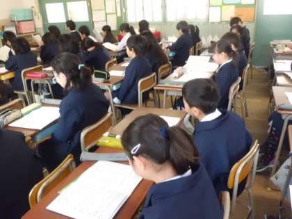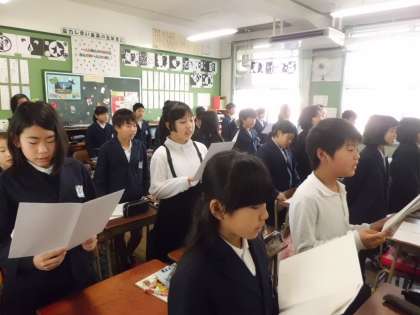 2月14日(火)5年音楽の時間です。「世界がひとつになるまで」という曲を全員で斉唱しています。頭声的発声を心がけて歌っていました。