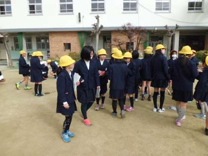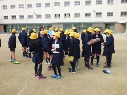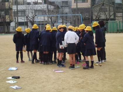 2月15日(水)5年生が算数科で「円周の長さ」の学習をしました。半径10mの円周をウォーキングメーターで、木や校内の丸い柱のまわりの長さを巻尺で測りました。実際に行うとよくわかります。