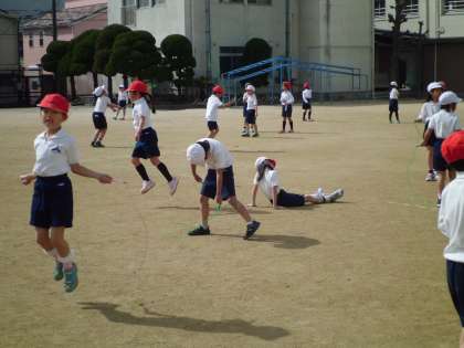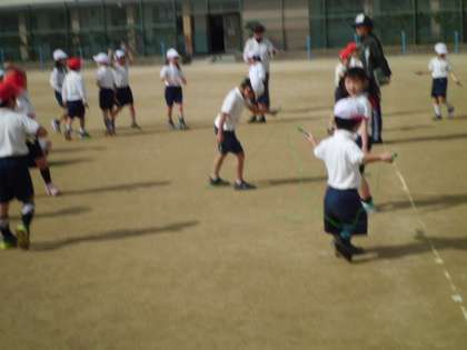 2月22日(水)3時限目、1年生の体育科学習の様子です。なわとび運動、5分間走(5分間で運動場が何周できるか)に取り組みました。なわとび運動は、上手に跳べなくて何度も何度もくりかえし跳んでいました。