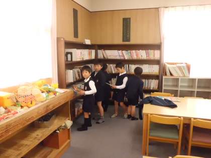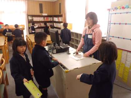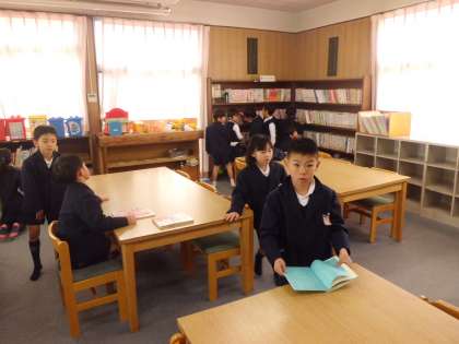 2月28日(火)1年2組図書の時間の様子です。図書補助の先生がパソコンを使って、本の貸し出しを行っています。子どもたちは静かに本を借り、読んでいました。新しい本の紹介もされています。
