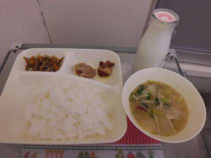 3月1日(水)の給食です。今日は鶏肉のてり焼き、さつまいものみそ汁、きんぴらごぼう、ご飯、牛乳です。さつまいものみそ汁には野菜がたくさん入っていました。