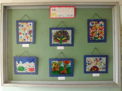 玄関の掲示物です。4年「光のさしこむ絵」です。来校された時にご覧ください。