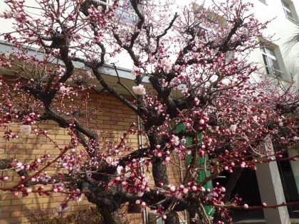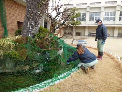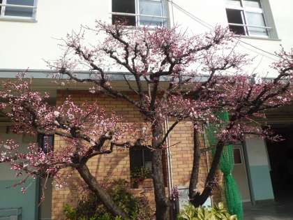 3月2日(木)運動場の梅がだんだんと咲き出してきました。春が近づいてきています。その横の池には鯉や金魚が泳いでいます。それをねらってサギがきます。ネットをしているのですが、その隙間から入り小さい金魚を食べてしまいました。さらにもう一枚ネットをかぶせてもらいました。