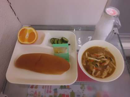 3月8日(水)今日の給食のメニューは、みそきしめん、あっさりきゅうり、清見オレンジ、りんごジャム、パン、牛乳です。