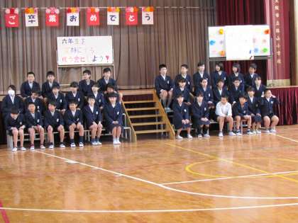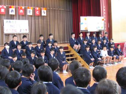 3月4日(土)3時限目、「卒業を祝う会」を行いました。各学年からのお祝いのことばや合唱、合奏は心のこもったものでした。6年生からは、在校生への温かいお礼のことばや合奏があり、インタビューでは6年生の様子を知ることができました。ご参観いただいた保護者の皆様、ありがとうございました。