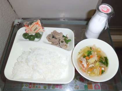 3月9日(木)の給食メニューです。今日は豚肉とれんこんのいため煮、すまし汁、ご飯、牛乳、きな粉よもぎだんごです。